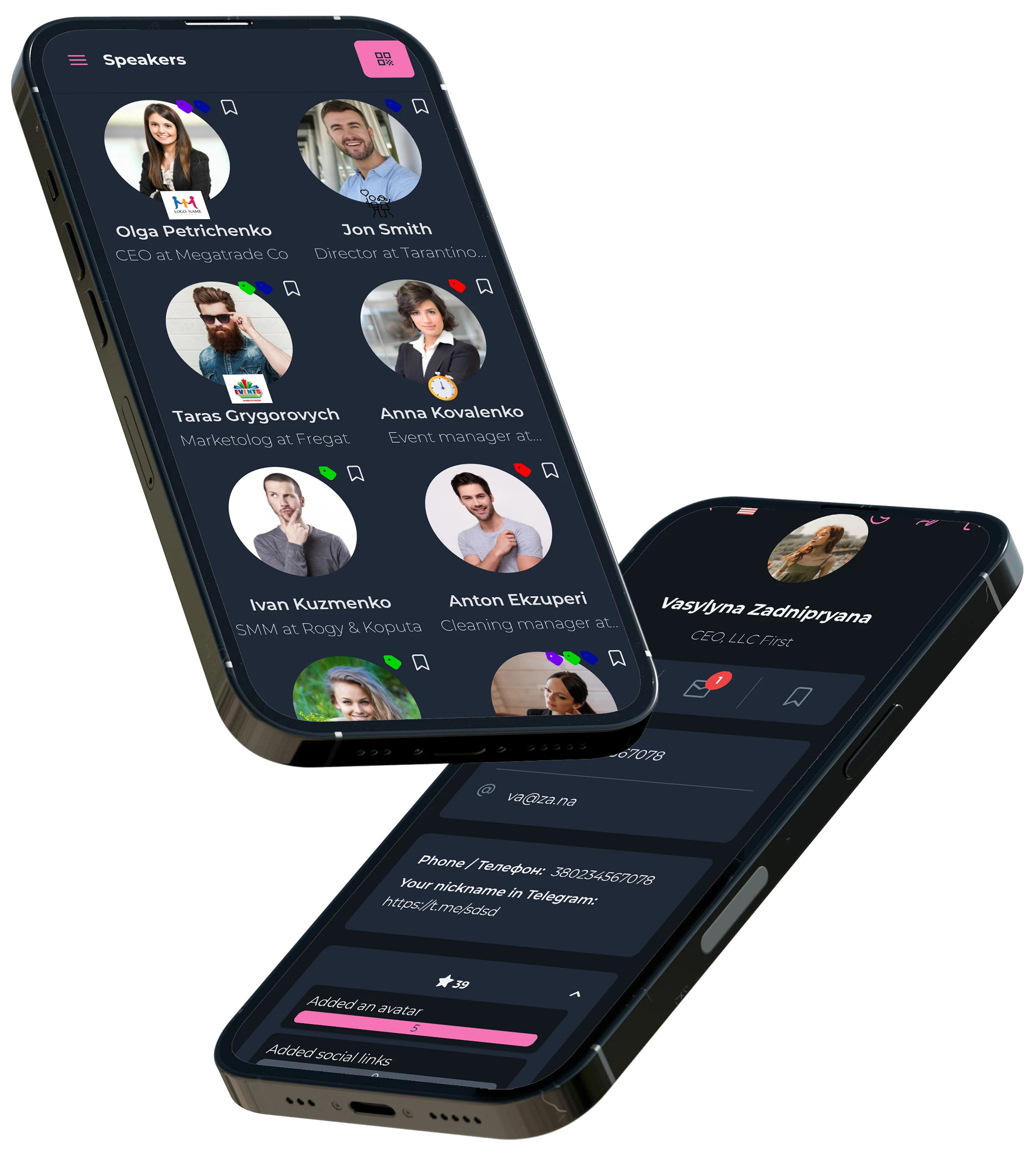 Категории гостей, отмеченные цветными стикерами, позволяют быстрее понять кто полезен для налаживания связей. Быстрый и простой отбор интересных контактов через TinderBiz, сканирование QR кодов на бейджах при знакомстве или просто из общего списка, и формирование тем самым своего лист контактов